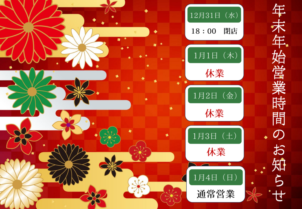 年末年始のお知らせ 投稿日 2025年12月10日 著者 ファミリーカット公式 カテゴリー お知らせ ※ 一部店舗では休業日及び営業時間が異なる場合がございますので直接店舗へ問い合わせいただきますようお願い申し上げます。